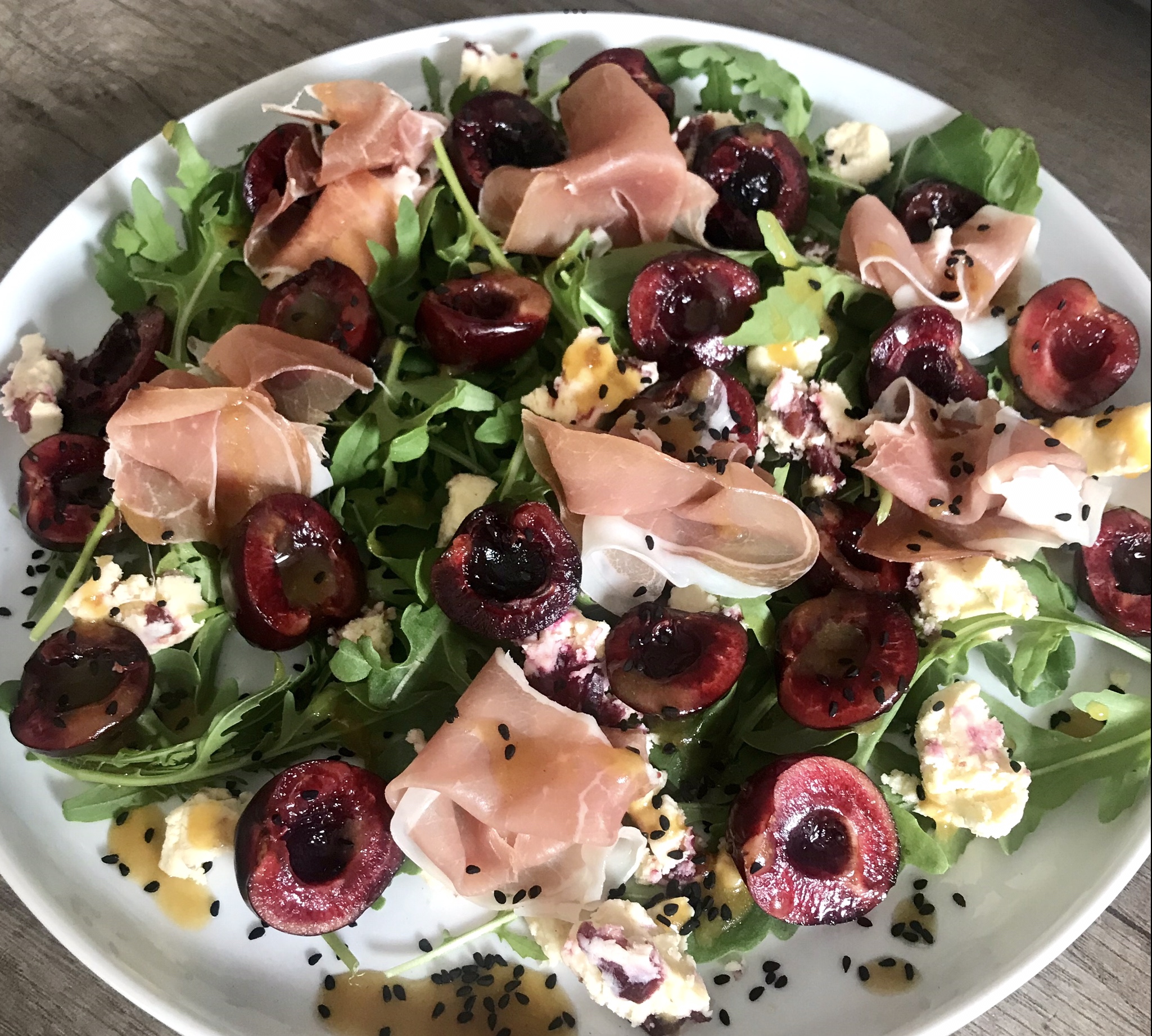 Sałatka z wiśniami i szynką.